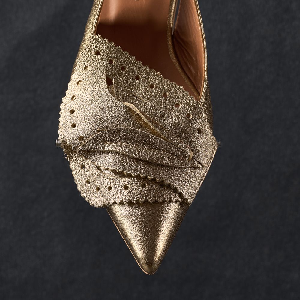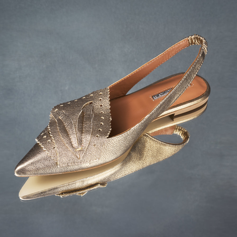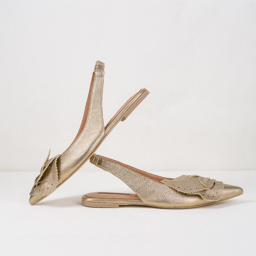 The B. Sunrise golden leather ballerinas from Mihaela Glavan offer a radiant and timeless addition to your footwear collection. Made from premium golden leather, these ballerinas feature an organic, vintage-inspired front detail that exudes classic charm. The pointed toe enhances the sleek, elegant silhouette, while the elastic back detail ensures a comfortable and secure fit.