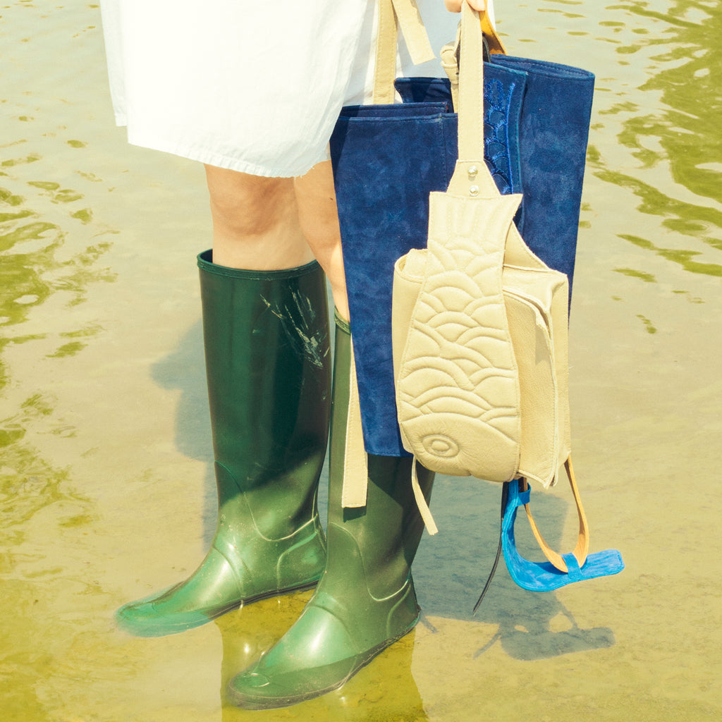Indigenous plants with names that still elude shy away from formal language such as chicory, zinnia, marigolds or yarrow are wreathed around the ankles of the creations designs executed in Mihaela Glăvan’s characteristic deconstructed style, defined by the quality of the materials and the craftsmanship. The designer incorporates the artist’s formal signature, the fish, which appears oversized on a multiple use purse bum bag, or deconstructed on the toe of a pair of boots. These adopted patterns are combined in collages that range from cohesive to contrasting, depending on scale and chroma.