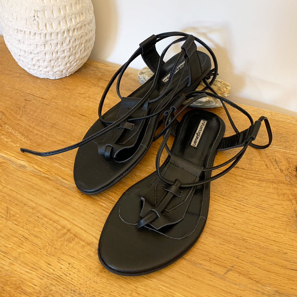 Light taupe leather sandals, long straps, natural leather lining, beige sole.
