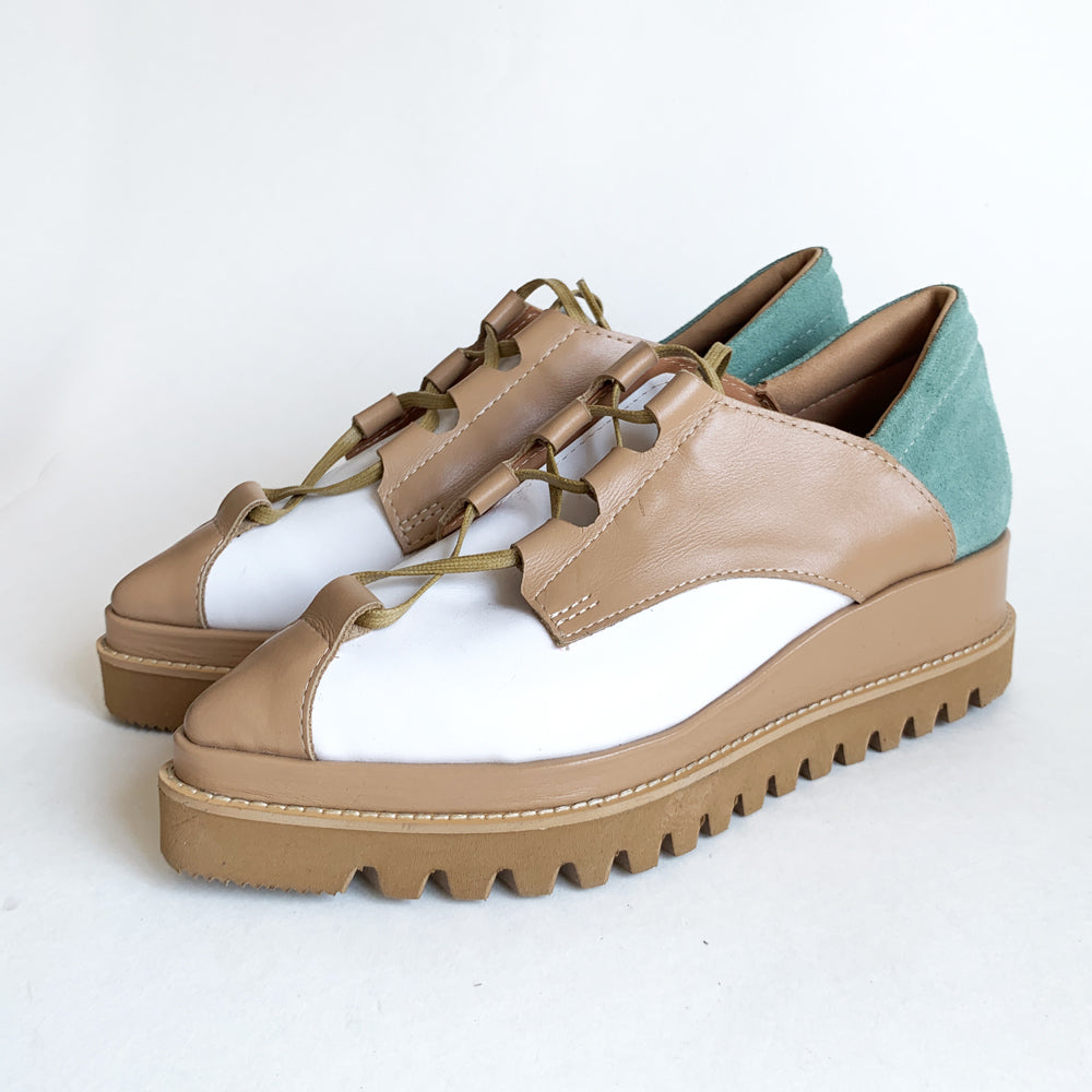 Beige leather flat platform shoes, cut-out details, natural leather lining, beige leather covered platform, brownie sole