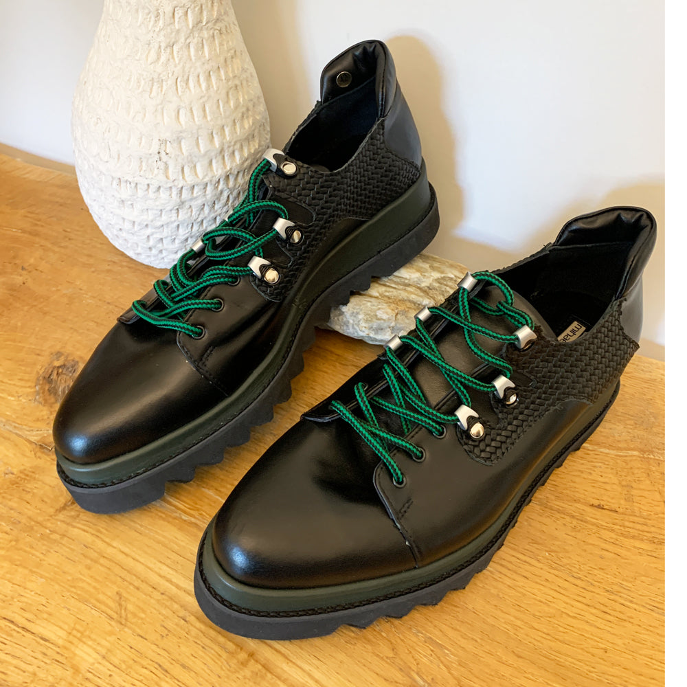 Blue  leather lace-up shoes, blue leather leaf  details  natural leather interior, blue  leather flat platform, turquoise  sole.