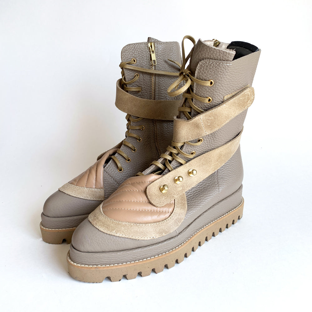 *Khaki nubuck lace-up boots, green leather leaf details, metallic accessories, natural leather lining, nubuck leather flat platform, black sole