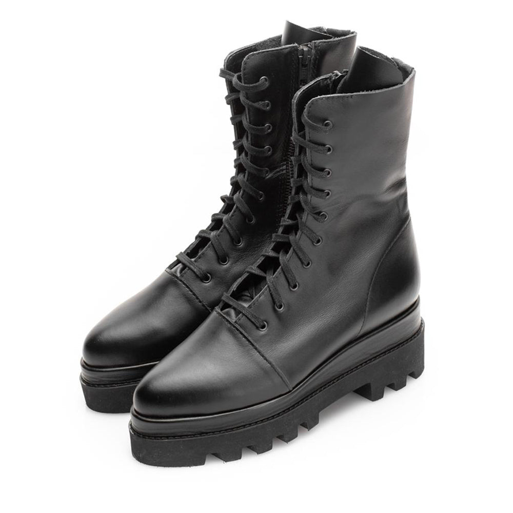The Hypnotize Me black leather booties are crafted from premium black leather, featuring intricate ton-sur-ton layers that draw inspiration from the delicate beauty of floral patterns. The black textile laces add a touch of style, while the natural leather lining ensures comfort. A black leather covered mid-sole pairs seamlessly with the black high sole, creating a striking contrast that completes the overall design.