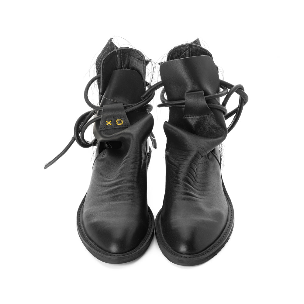 The XOXO Paper Game black leather booties by Mihaela Glavan exemplify a stylish meld of textures and meticulous craftsmanship, ideal for those who value a blend of subtlety and distinct design elements. Made from premium black leather, these booties feature multiple layers of varied textures, creating a dynamic and visually interesting appearance that catches the eye without overwhelming.