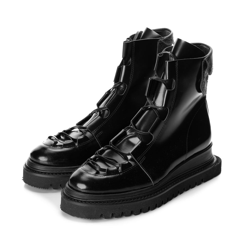The XOXO Paper Game black leather lace-up booties by Mihaela Glavan are a stunning addition to any wardrobe, combining classic elements with distinctive embellishments. Crafted from high-quality black leather, these booties provide a robust and sophisticated base. The lace-up design ensures a snug and adjustable fit, while the addition of XO sewing details injects a playful and intimate touch, symbolizing hugs and kisses.