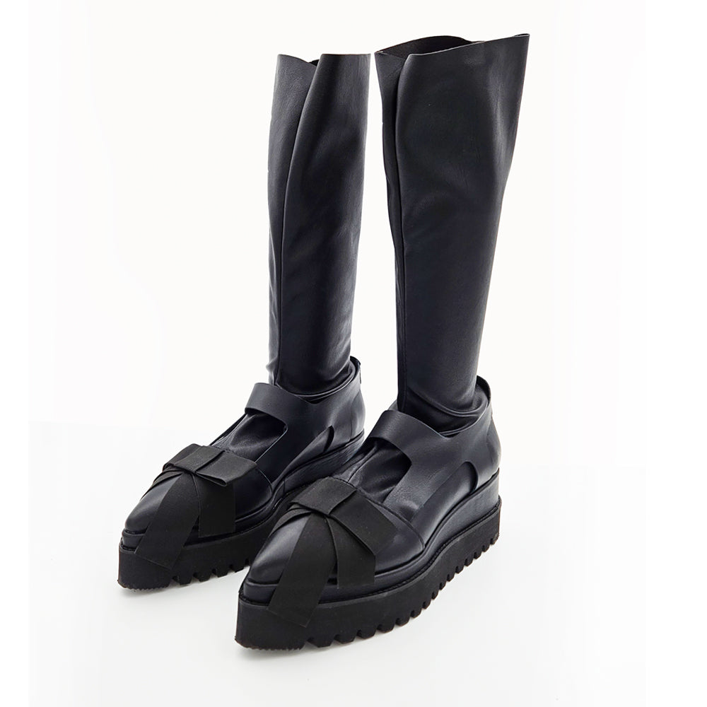 The Anime Fascination black stretch boots by Mihaela Glavan are a stunning statement piece, combining daring design elements with a sleek profile. These over-the-knee boots are crafted from black patent leather, offering a glossy, eye-catching finish that stands out in any wardrobe. The boots feature ecological stretch leather, ensuring a snug yet comfortable fit that adapts to the contours of your legs. A distinctive beige leather bow with ribbed detail adds contrast, enhancing the boots' visual appeal. The interior is lined with leather for durability and comfort. One of the most striking features is the sequin-embellished mid-sole, which adds a playful sparkle, while the high sole and black bottom provide stability and a continuous sleek look.