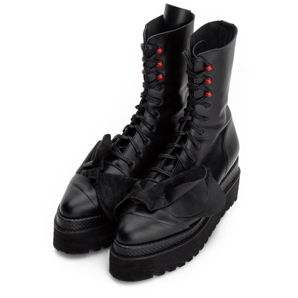 The In Bloom black leather booties by Mihaela Glavan artfully combine classic style with a touch of natural charm, featuring intricate floral details. Crafted from premium black leather, these booties ensure durability and a timeless aesthetic. The floral embellishments add a delicate and artistic element, making each step a statement of style. Inside, the natural leather interior provides a comfortable and breathable environment, perfect for day-long wear, while the unlined uppers mold to the shape of your foot, enhancing comfort over time. The high sole offers added elevation and a modern look, complemented by a black metal zipper that not only provides easy access but also adds a sleek, contemporary finish.