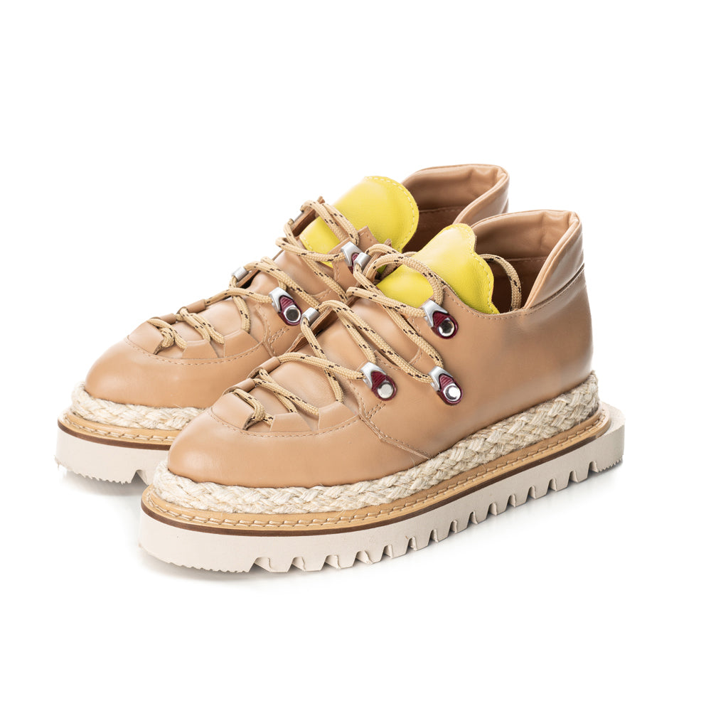 The Don't Blame Me beige leather flat platform shoes by Mihaela Glavan are a harmony of neutral elegance and subtle contrasts, designed for those who navigate the fine line between classic and statement style. Crafted from supple beige leather, these platform shoes are both versatile and eye-catching. Bordeaux accessories add depth and a touch of style, enhancing the overall aesthetic with a pop of color. The inclusion of two-tone textile laces offers an additional layer of visual interest, providing a customizable and secure fit. The jute-covered flat platform infuses a rustic, yet refined vibe, perfect for adding texture to your look. Completing the design, a beige sole with a deliberate black detail creates a distinctive edge, grounding the shoes in modernity.