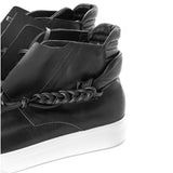 The Crossroads black leather high top women sneakers by Mihaela Glavan are a blend of style and functionality, designed to cater to both women and men. These unisex sneakers are crafted from premium black leather, featuring intricate braided black leather details that add a touch of style and depth to the durable design. Metallic accessories introduce a modern flair, while the black leather shoelaces ensure a secure and adjustable fit. Inside, the natural leather lining provides a comfortable and breathable environment for your feet, suitable for all-day wear. The contrasting white sole not only offers a striking visual appeal but also delivers durability and traction, making these sneakers as practical as they are stylish.