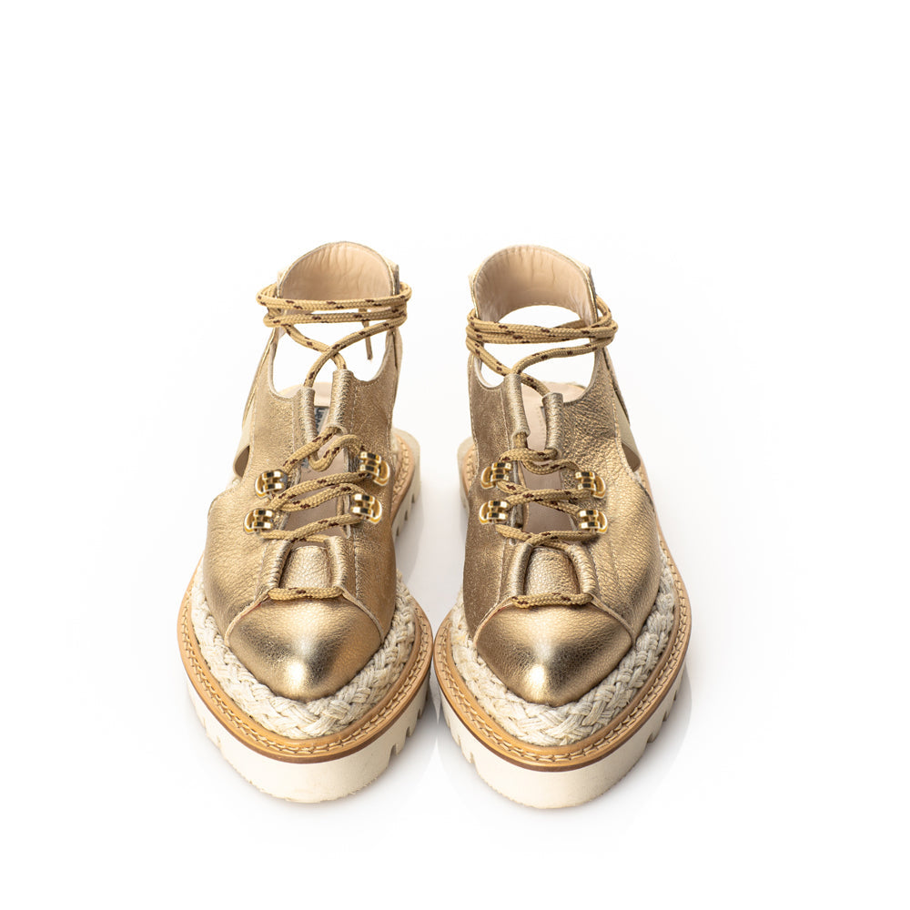 The Summer Sense gold leather flat platform shoes by Mihaela Glavan encapsulate the essence of sun-kissed days and warm, breezy evenings. These radiant shoes are constructed from shimmering golden leather, ensuring you stand out with every step. The intricate cut-out details not only add a touch of style but also enhance breathability, making them perfect for the summer heat. The two-tone textile laces offer a secure fit while introducing an additional layer of color and texture. Inside, the natural leather lining promises comfort for all-day wear. The jute-covered platform adds a rustic charm and complets the design both literally and stylistically. A beige sole complements the golden hue, providing a polished finish and durable foundation.